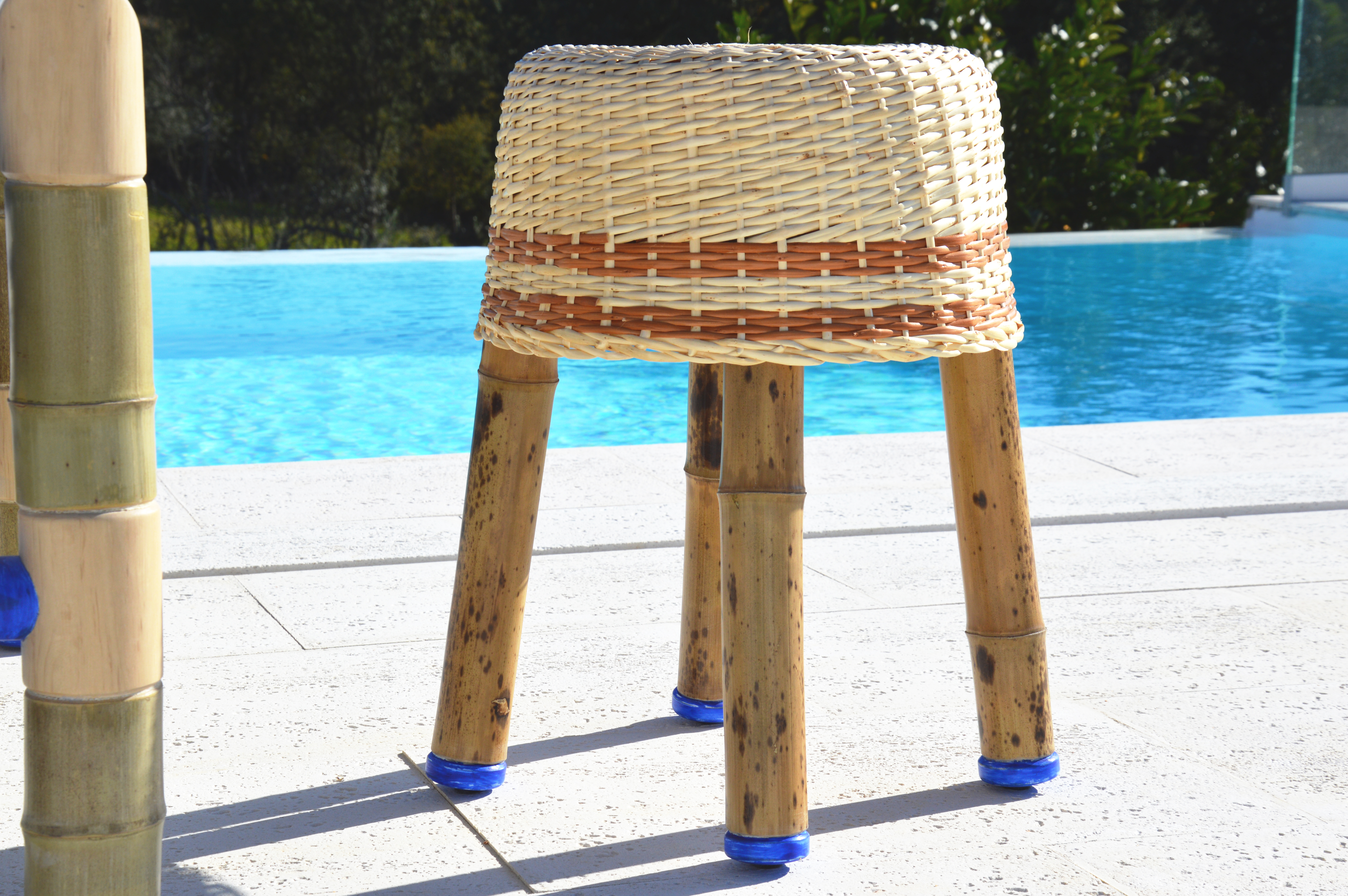 Contraplacado marítimo e bambu, pés em madeira com tratamento de pigmentos naturais e cestaria de vime.